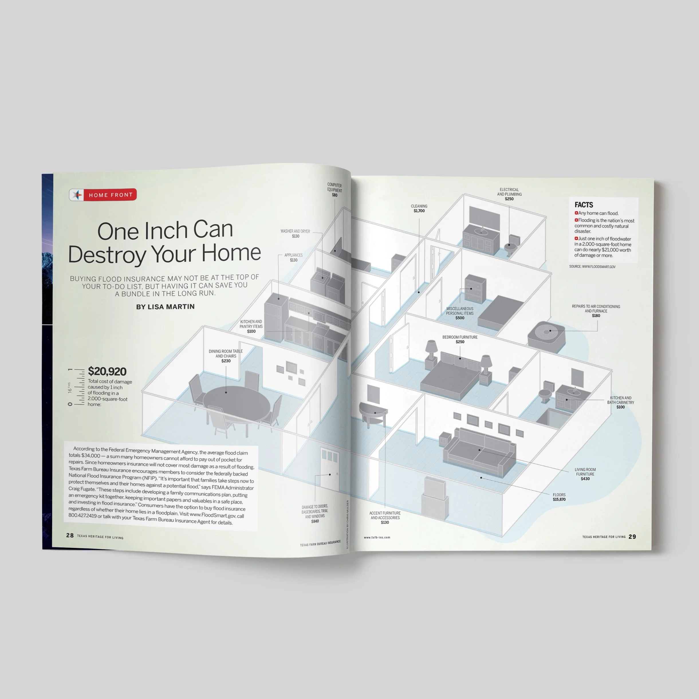Texas Heritage for Living magazine needed a series of illustrations that focus on preventative measures homeowners can take to avoid costly home repairs. This illustrations depicts the extent of damage that can occur from just an inch of water. The design brief required me to showcase fifteen different items while considering the spacing needed for editorial elements. To accomplish this, I opted for a dollhouse aesthetic that allows each item to be easily discerned visually before requiring any reading.